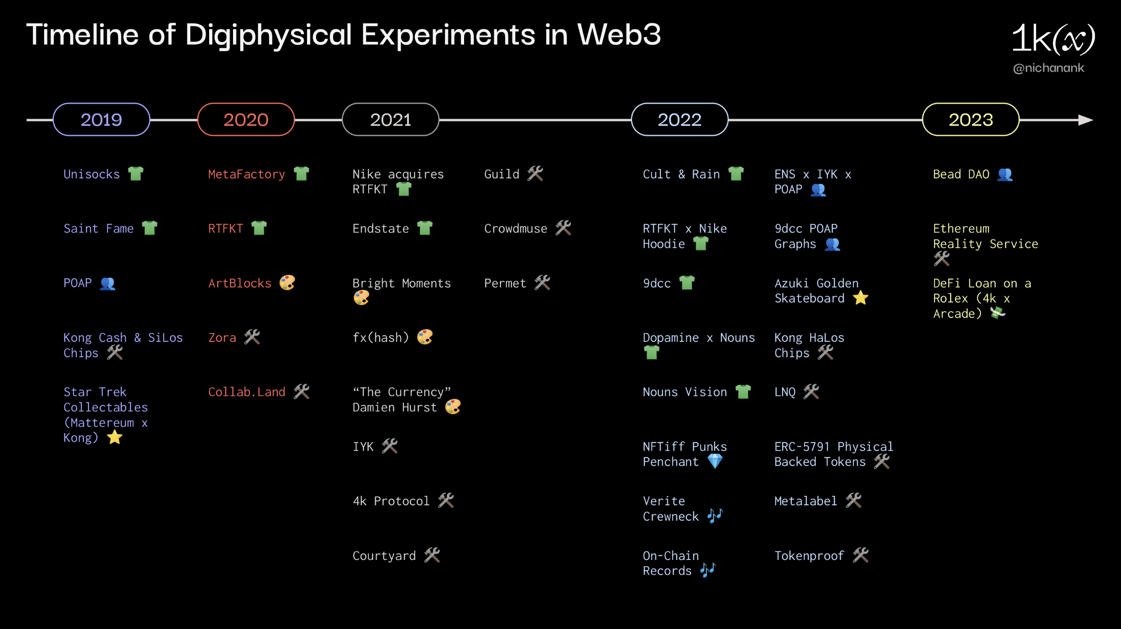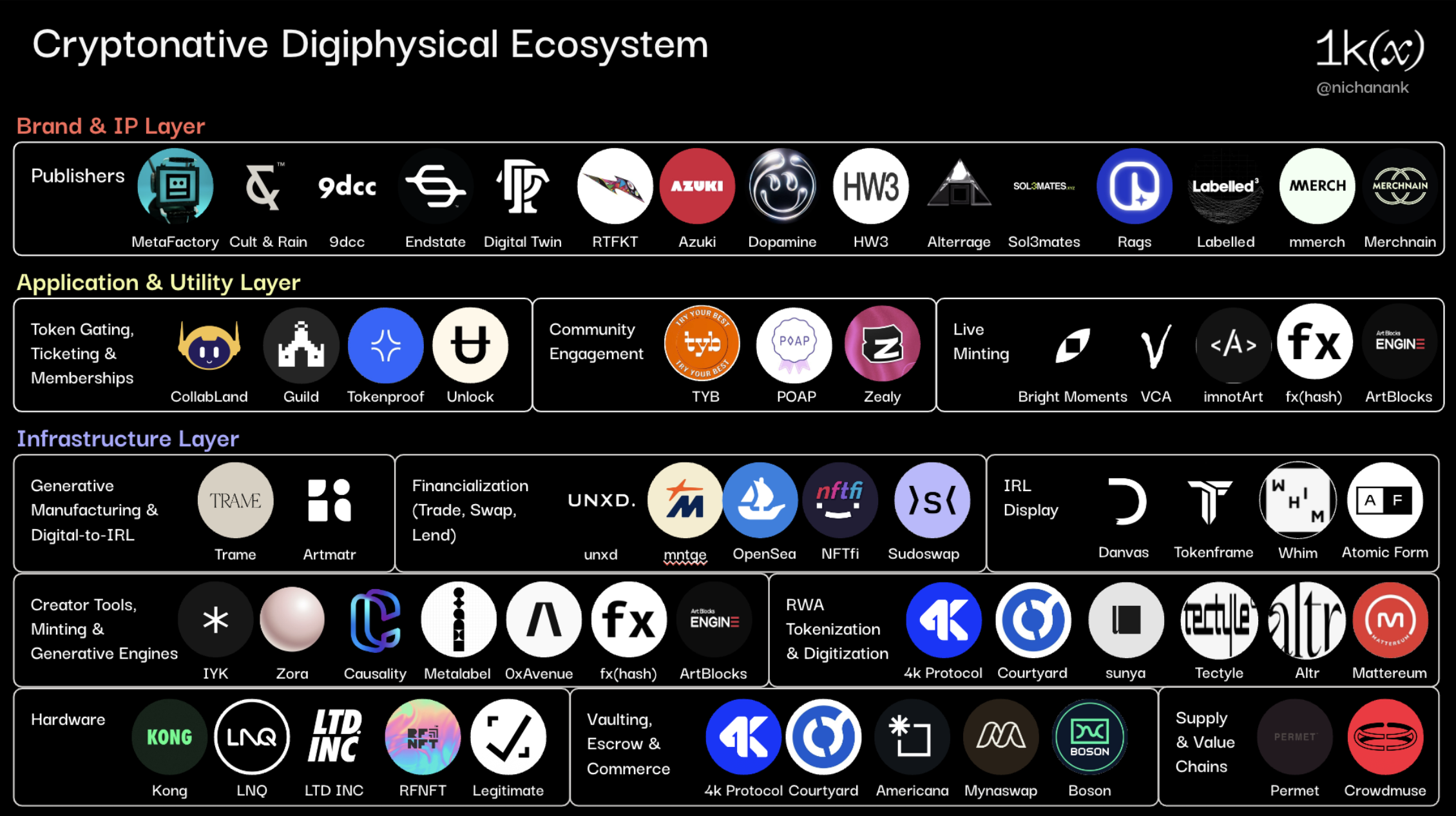 Creator Tools, Minting & Generative Engines. The programmability layer on top of hardware infrastructure enable creators to design digiphysical experiences. IYK* provides chip-agnostic software modules for issuers, including post-distribution tooling like tap analytics. Causality is middleware for linking chipped physical goods to digital environments. Metalabel* is a platform for creators to discover each other and co-release work in the form of digiphysical record bundles as well as IRL experiences. fxhash, ArtBlocks provide minting engines for generative art, enabling live minting experiences at galleries and IRL events.