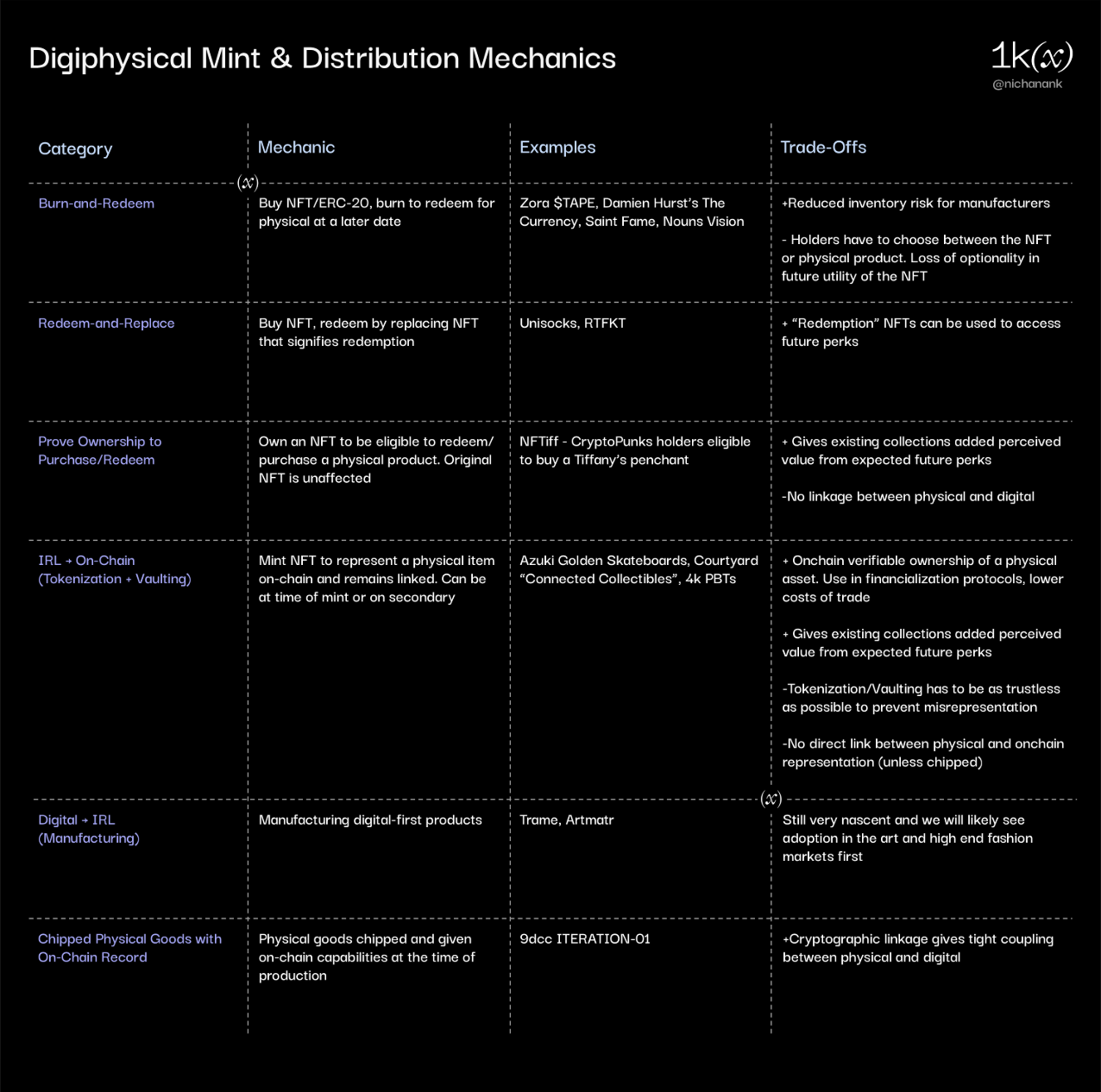 Within crypto, early experiments include selling unchipped “Digital Twin” products through onchain mechanics like burn-to-redeem. Here, the owner has to burn/replace the NFT in order to claim a physical product, or claim an NFT add-on after making a physical purchase. Like bundles, early “digital twin” products treat each counterpart as a secondary offering as opposed to product components that are deeply integral to one another.