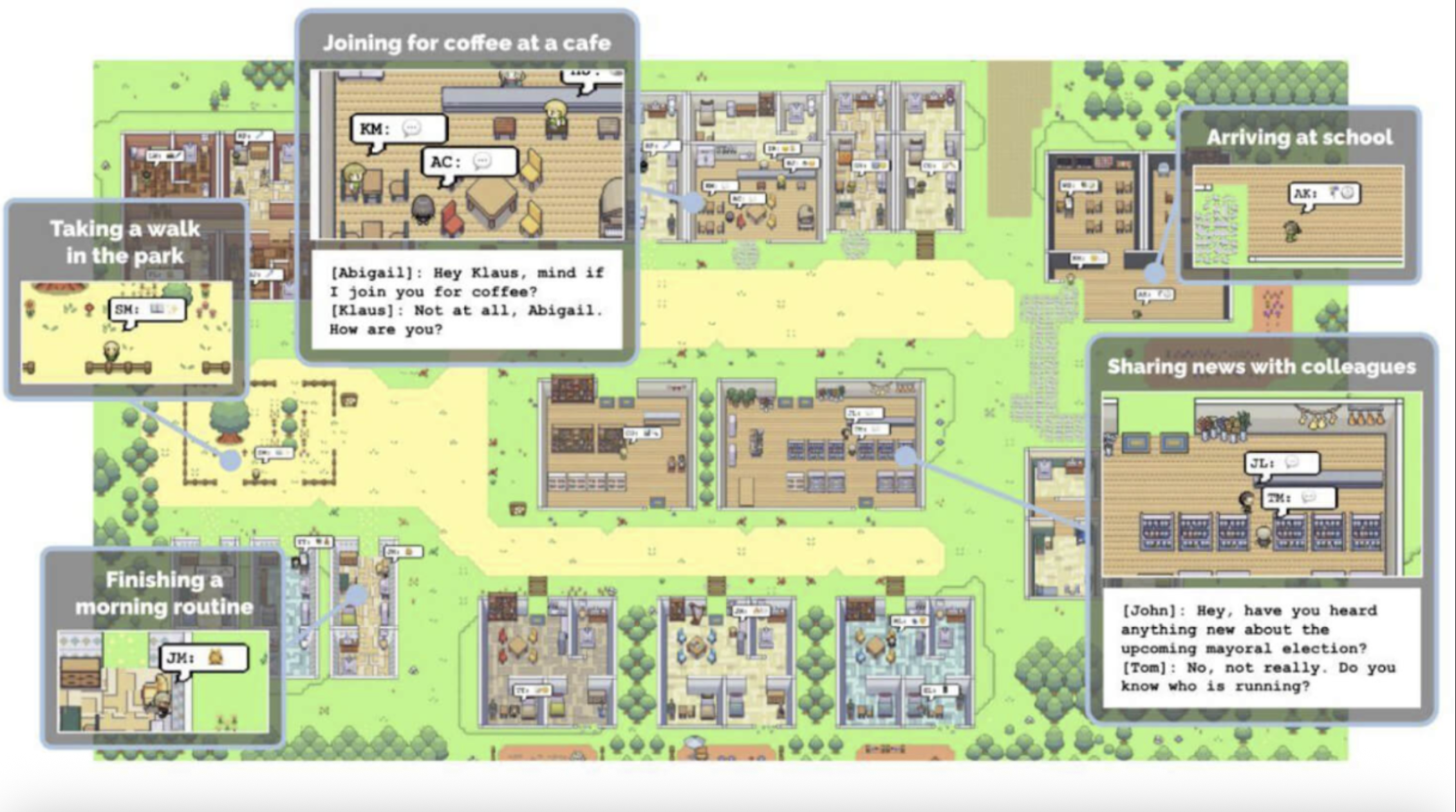 While there are plenty of great examples in web2 of new game loops, here we will focus on web3-specific examples. However, it is worth mentioning the academic piece that woke up many to the possibility of multi-AI agent gaming environments. Researchers from Stanford and Google demonstrated this potential by applying LLMs to agents in a sandbox game environment. The LLM-powered agents exhibited impressive behavior, including independently spreading party invitations, forming friendships, asking each other out on dates, and coordinating to attend a party on time, all based on a single user-specified suggestion. The approach utilized an architecture that extended the LLM to store and synthesize memories into higher-level reflections, enabling dynamic behavior planning for the agents.