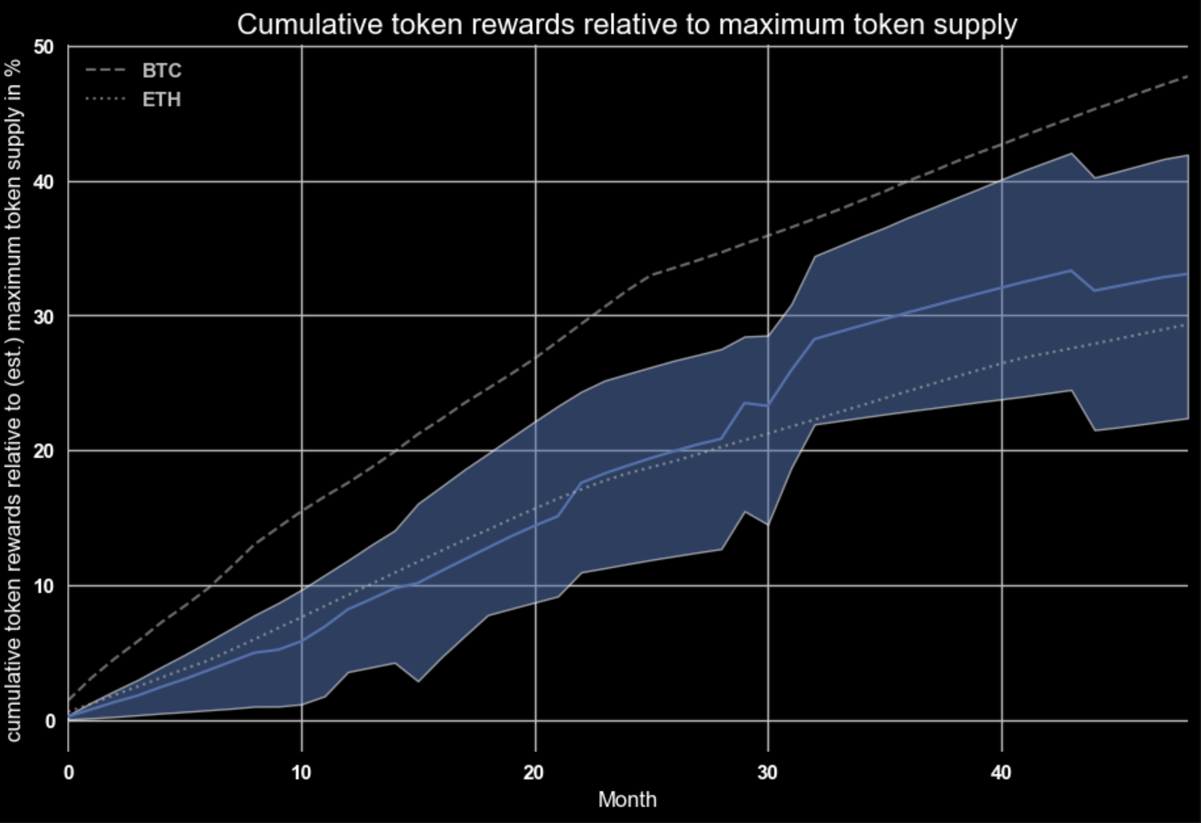 It is interesting to see that despite different schedule design and areas of infrastructure served (e.g. storage, compute, etc) the monthly issuance relative to total supply are in similar ranges initially at around 0.2% to 1.2%, before fading out beyond two years. Relative emissions for miner revenues of Bitcoin (dashed line, after 09/2010) and Ethereum (dotted line) are in similar ranges as well. This is also reflected in cumulative reward emissions: