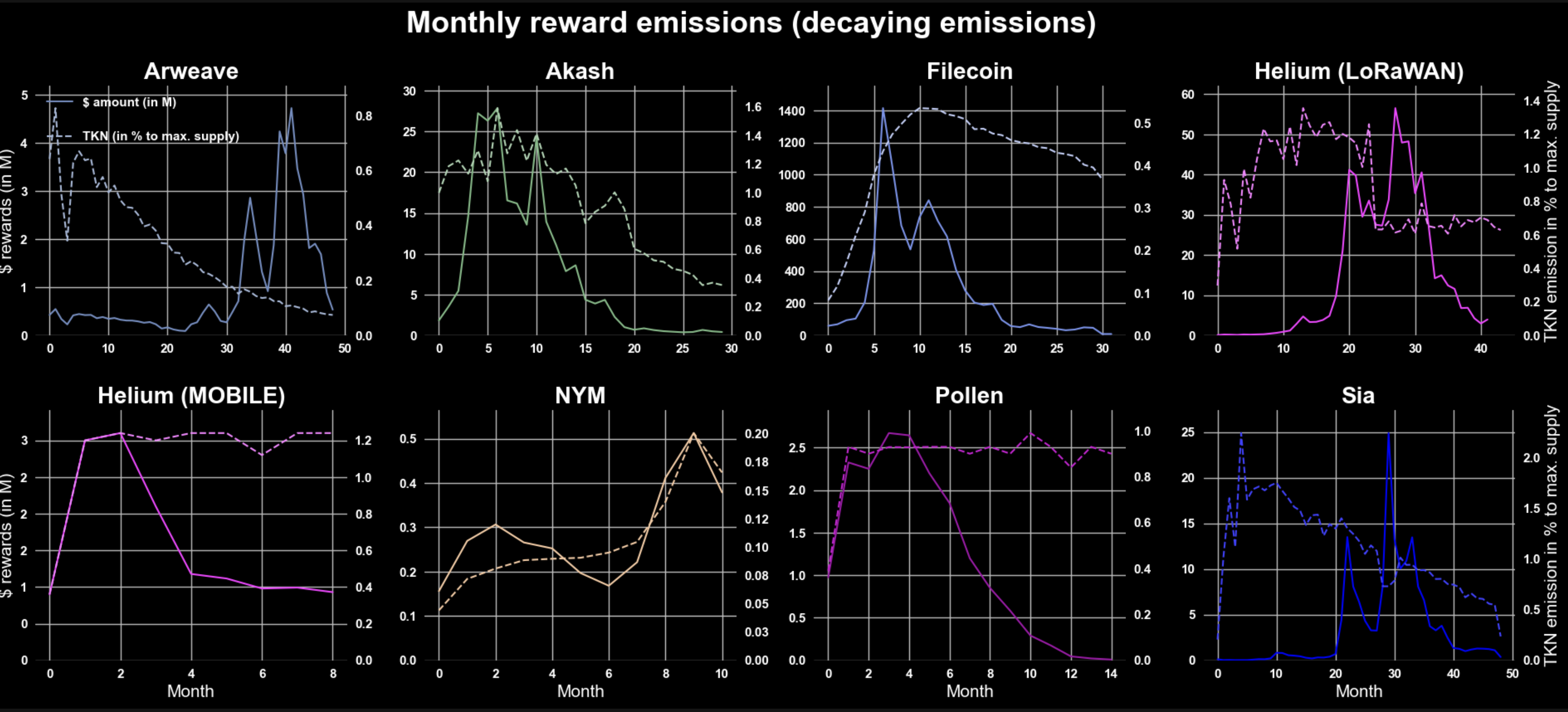Filecoin: incorporated the 180 days linear unvest of 75% of the emitted token rewards for the conversion to dollar values. Helium MOBILE, Pollen and NYM haven’t seen their emission reductions yet, hence no decline in the dashed lines yet