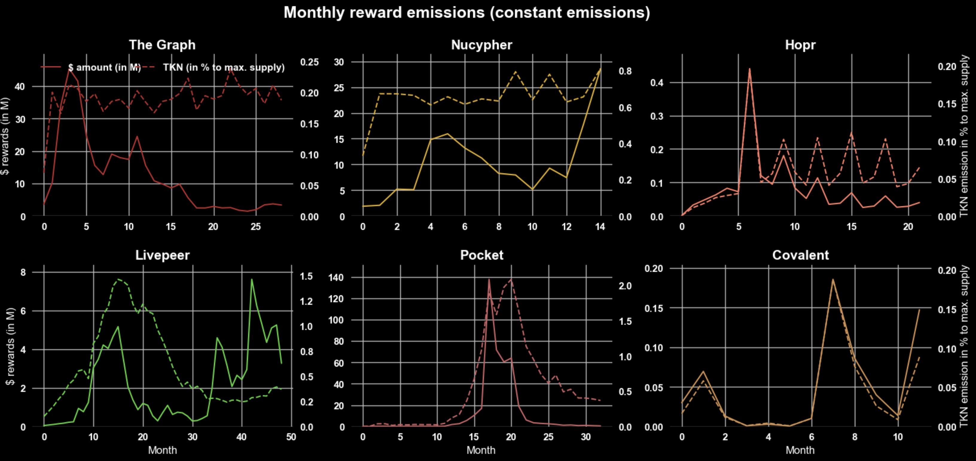 NuCypher shows emissions of phase 1 before merger into Threshold network, worklock token emission not included; Hopr: As mentioned earlier, cover traffic hasn’t launched where monthly token emissions are planned to be 1% of total supply until month 27; Covalent nodes couldn’t fully claim rewards between month 3 and 7 related to the Nomad hack on Moonbeam