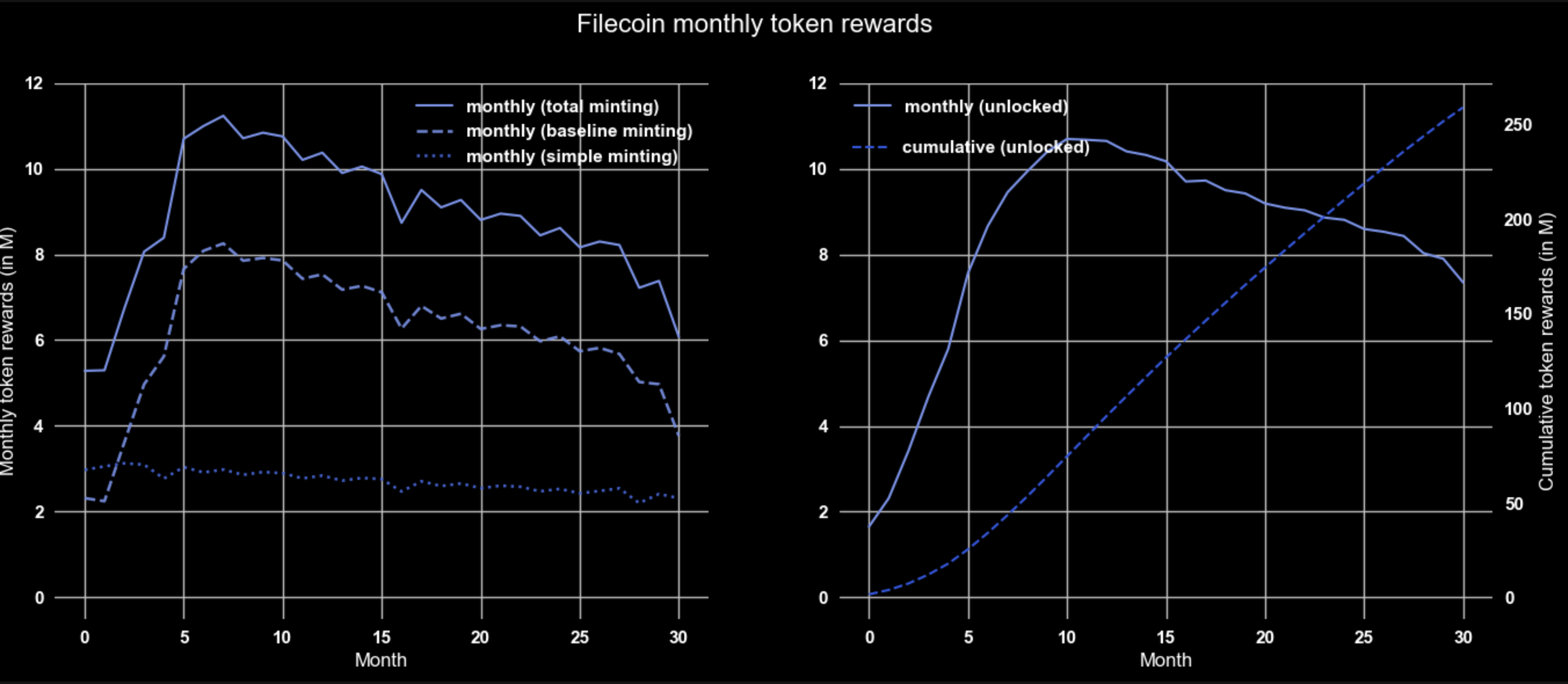 Filecoin has a dual minting model: simple and baseline minting. The former allocates 30% and the baseline minting allocates the other 70% of rewards (55% of the total supply of 2 B FIL). Baseline minting emits rewards according to its KPI of an (increasing) target baseline of storage capacity provided by the network: Whenever the actual storage capacity of the network exceeds the current target baseline, the rewards are capped.