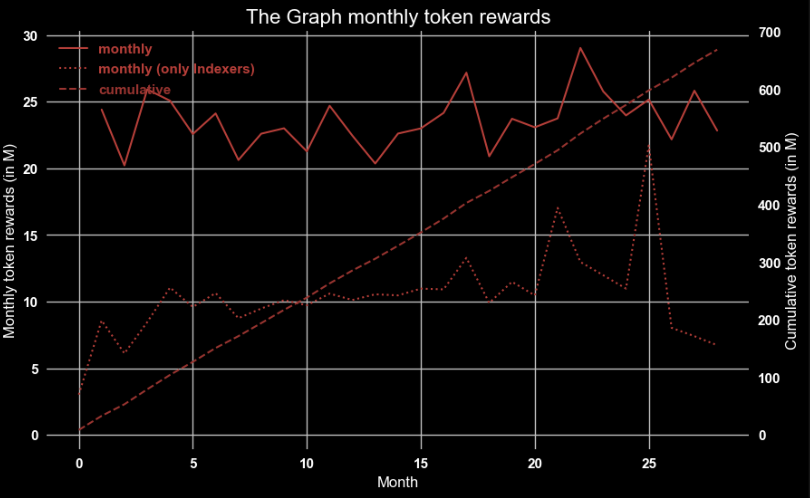 The peak of NuCypher is the last month of emissions before the merger into the Threshold network. The peak of The Graph shown is one of the last data points available.