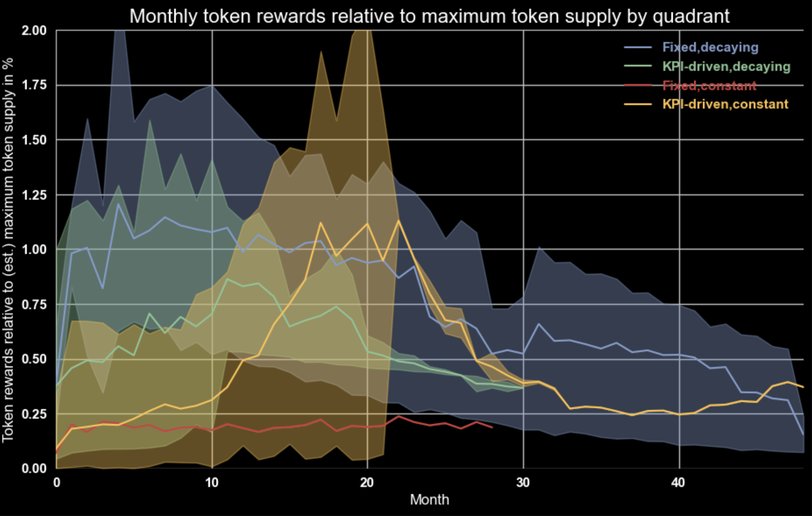 Takeaway: Constant emissions depending on KPIs are often as volatile as the KPI. They offer a high degree of flexibility, even more so when governance is able to adjust it. With great flexibility comes great complexity though — if one does not model and plan for the variety of potential scenarios one might run into situations which can put a lot of strain on the network participants.