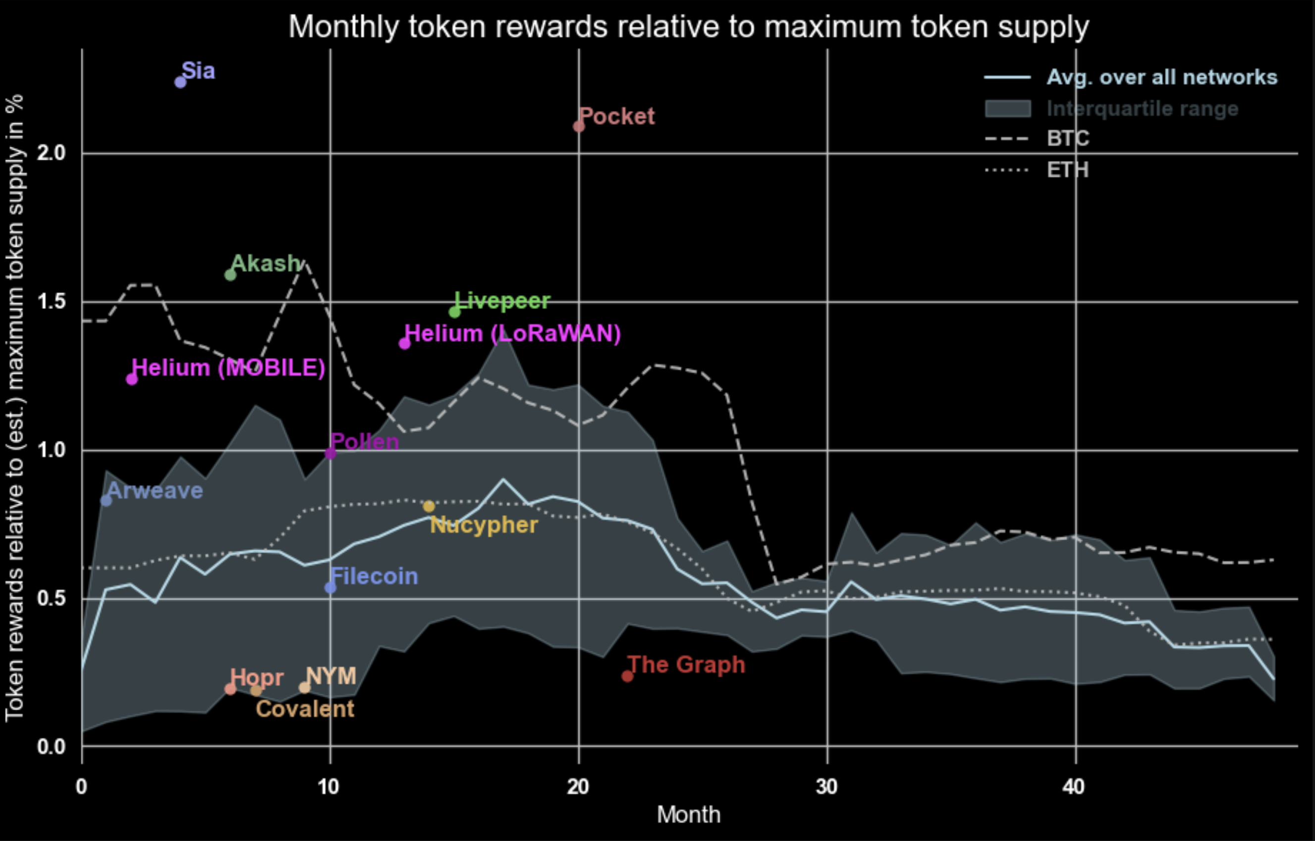 While operating a variety of services, Web3 infrastructure networks follow a similar range of monthly reward emission (i.e. 0.2–1.2%), with decreasing emissions typically after 2 years. More recently launched networks seem to be on the lower spectrum of that range — this seems to be related to higher market capitalization of those networks when they start their rewards emission, but needs more research.