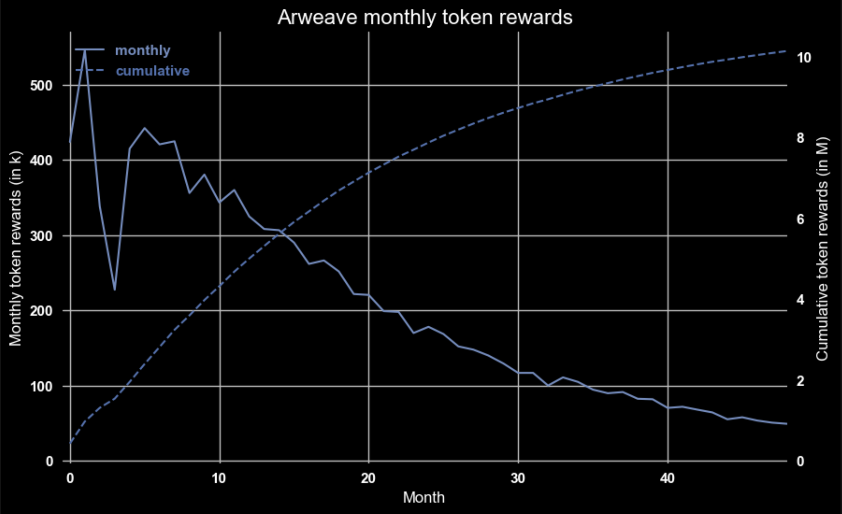Helium (LoRaWAN): After the adjustments (mentioned in the ‘Ability to adjust’ examples²), Helium halves the reward emissions every two years (starting with 2.2% of total supply (5 M HNT) per month). Hotspots get a yearly adjusted share of those³.