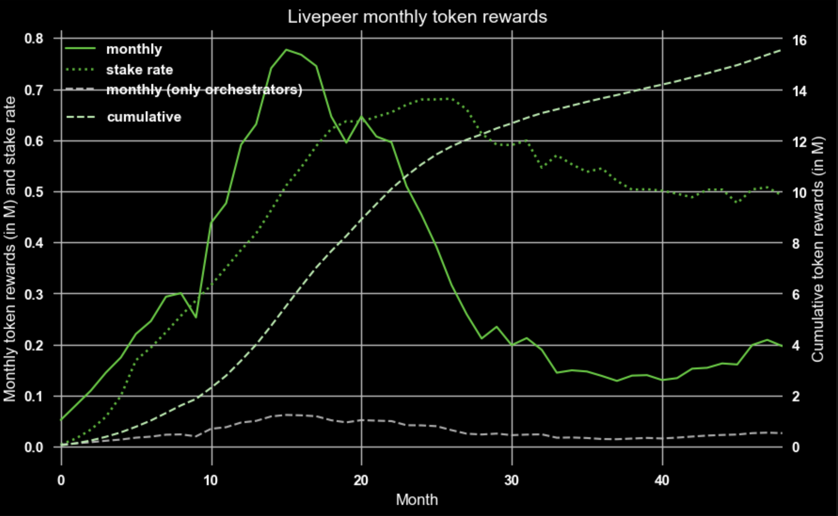 If we zoom out a bit further and look at all schedules, a common pattern is that peak of reward emissions (see the dots in the below graphic) is in the first year, Livepeer (~month 15) and Pocket (~month 19) - both in the KPI-driven, constant quadrant — are noteworthy exceptions (per its schedule designs The Graph and NuCypher don’t have a peak)⁸.