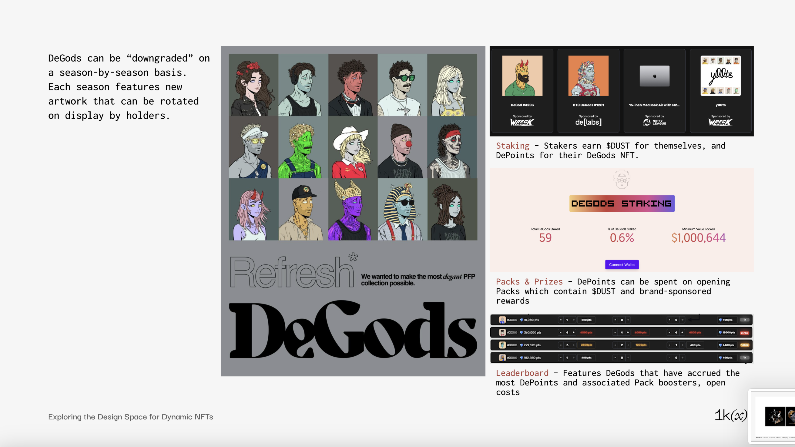 DeGods unveils new artwork and traits to its PFP collection every season. Holders spend $DUST to upgrade their NFTs, and can choose which metadata they want displayed. Staking DeGods accrues more $DUST to the holder and DePoints to the staked NFT. DePoints can be spent in-game to open Packs that contain $DUST or brand-sponsored rewards, with a leaderboard of DeGods that earned the most points for the current season.