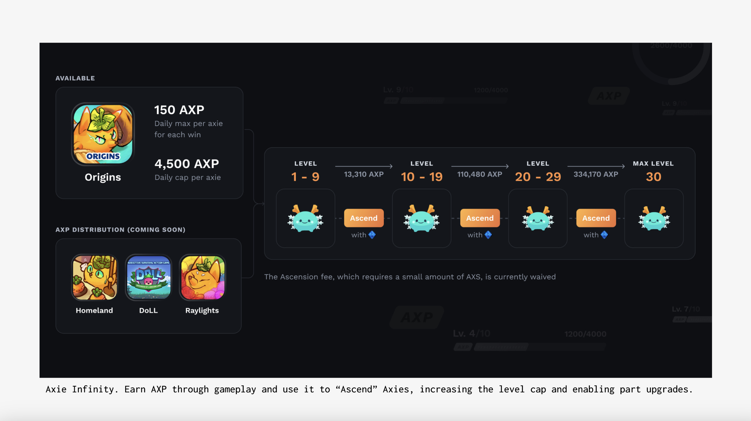 Axies that win ranked battles earn Axie-bound Experience Points (AXP), which can be used to “Ascend” Axies. Doing so syncs offchain game progress onchain, raises the Axie’s level cap, and allows players to upgrade Axie parts.