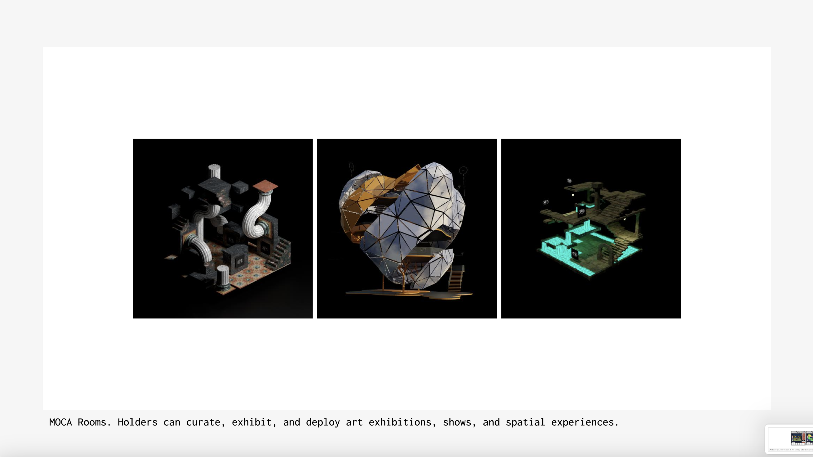Land that evolves as holders and visitors interact with it via art curation e.g. MOCA ROOMS, or land builds and gameplay e.g. Upstreet, Hyperfy, Otherdeeds, Voxels