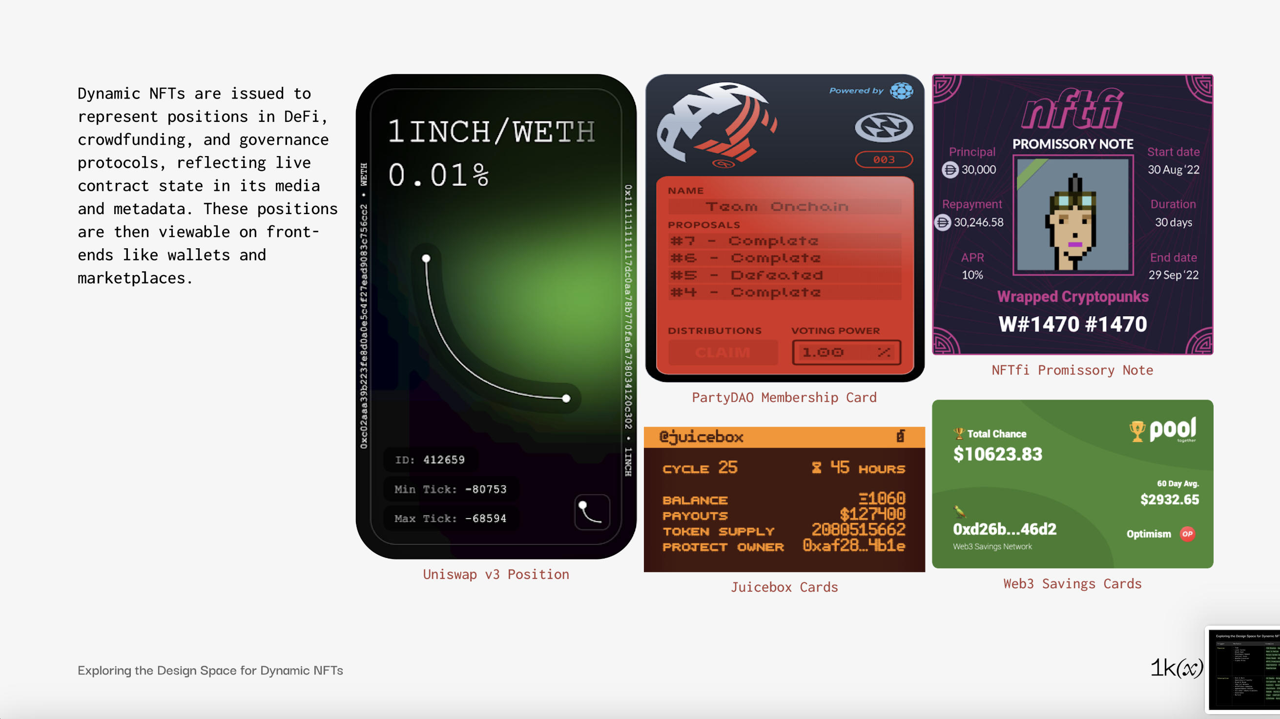 NFTs whose media renders purely from onchain data evolve autonomously based parameters such as time, block hash, wallet address, which deterministically influences the artwork. Outside of onchain art and games which often require bespoke implementation per collection, NFTs with media reflecting onchain state can be used as commemorative or “receipt” NFTs to represent things like a DeFi position (Uni v3 Positions, Web3 Savings Cards), governance rights (PartyDAO Membership Cards, Juicebox Cards), or community membership card with some accrued reputation (JPG Canonicons, Deca).