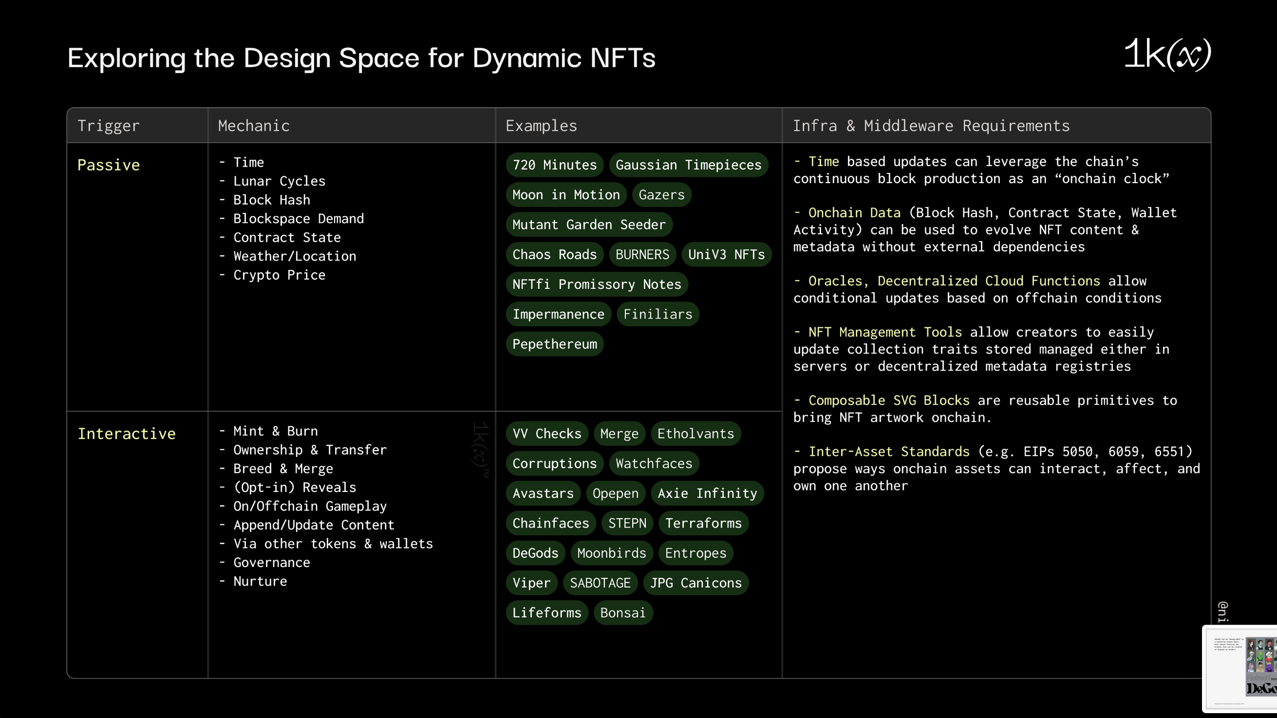 Dynamic NFTs are an exciting category-agnostic form factor for digital objects. Despite the nascency of supporting infrastructure, the ecosystem has actively been innovating on techniques to bring generative media and metadata onchain, and building composable primitives that can be reused by other projects.