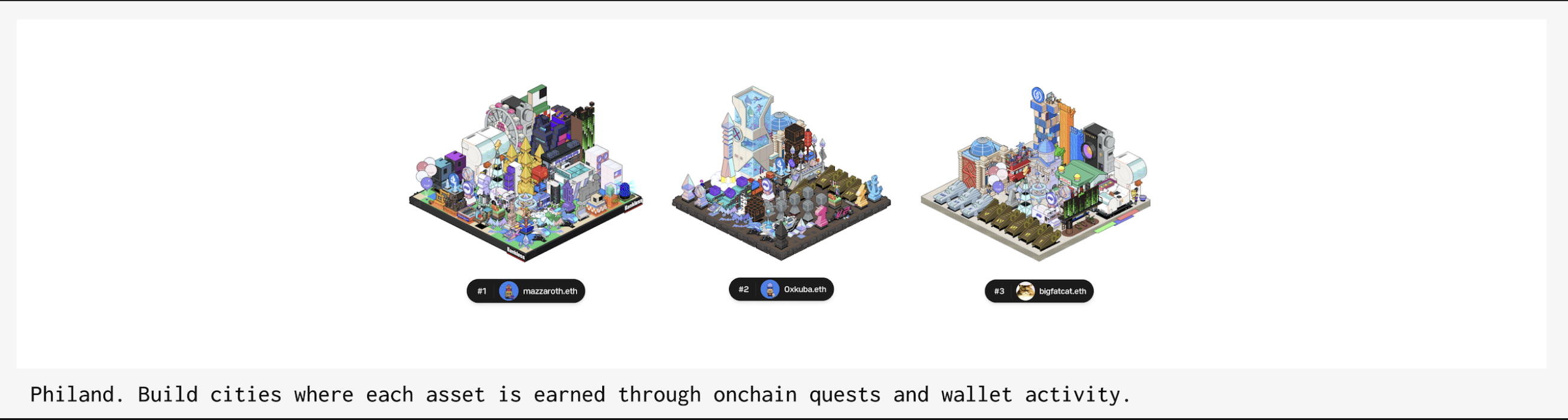 Onchain activity across applications directly influence NFT traits e.g. Zerion DNA. Philand cities depict wallet activity, and each in-city asset earnable through quests