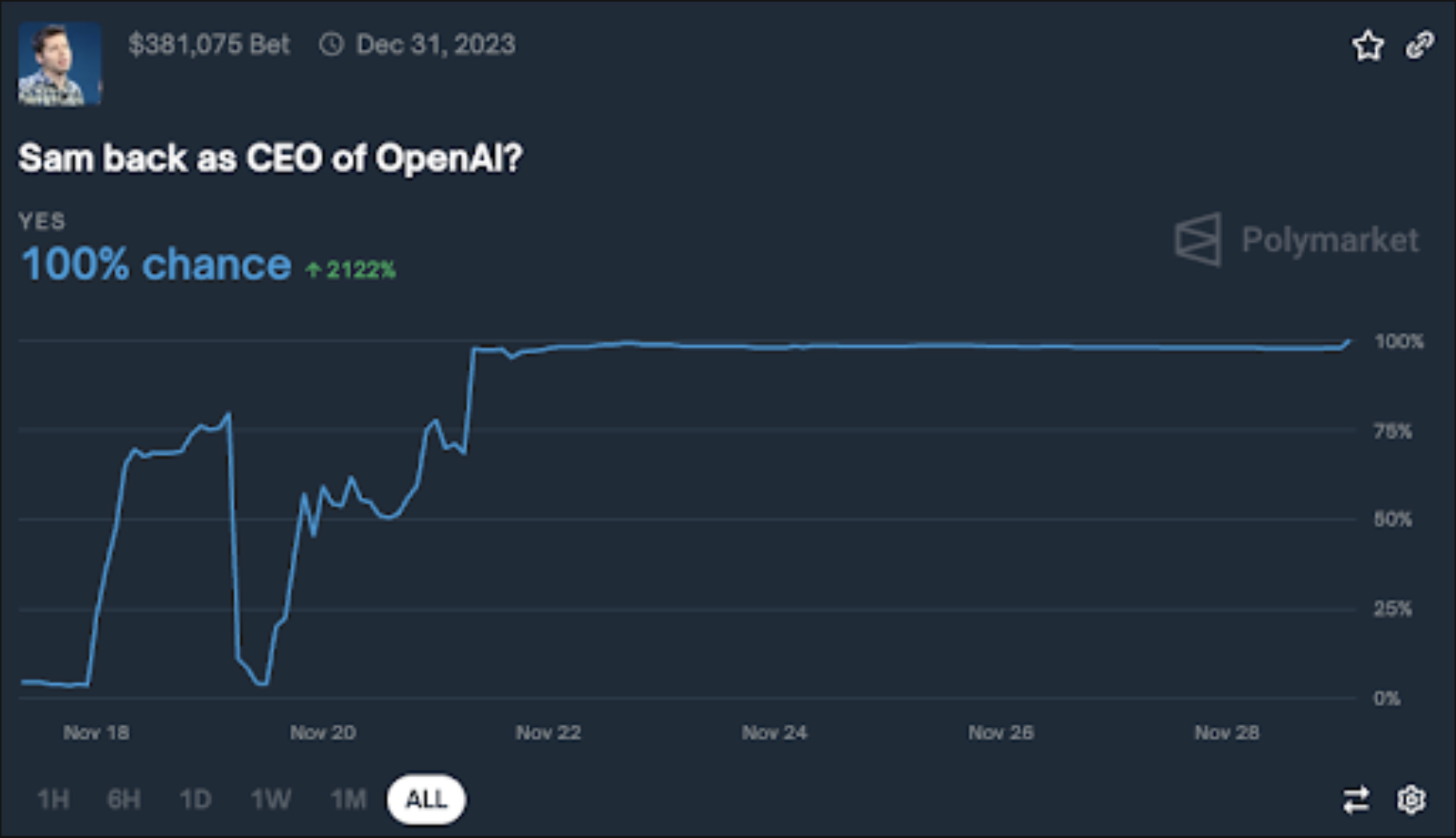 Lack of liquidity due to volatility: Polymarket’s most popular markets tend to be conceptually novel ones with scarce relevant historical data, making outcomes challenging to predict and price accurately. For instance, predicting whether or not a CEO, such as Sam Altman, will return to his position after rumors of potential AGI mishandling is difficult because no past events closely mirror this scenario. Market makers will put up larger spreads and less liquidity on uncertain markets in order to compensate for implied volatility (i.e. wild price action in the Sam Altman CEO market, where consensus flipped 3 times in less than 4 days). This makes it less appealing to whales who want to bet in size.