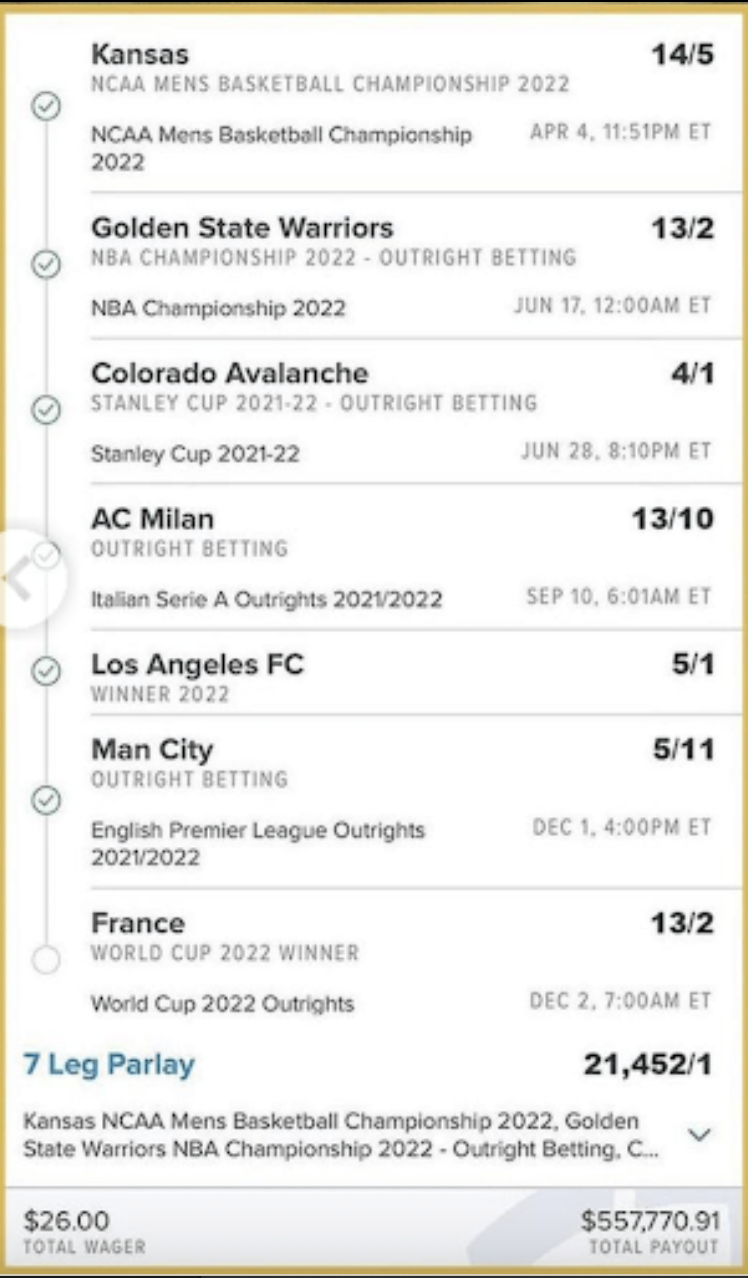 These bets give limited upside if placed on their own, but when combined into a parlay, the implied return skyrockets to ~1:650,000, meaning that the bettor could win $6.5 million if every bet is correct. It is not too hard to envision how parlays could gain PMF amongst crypto users: